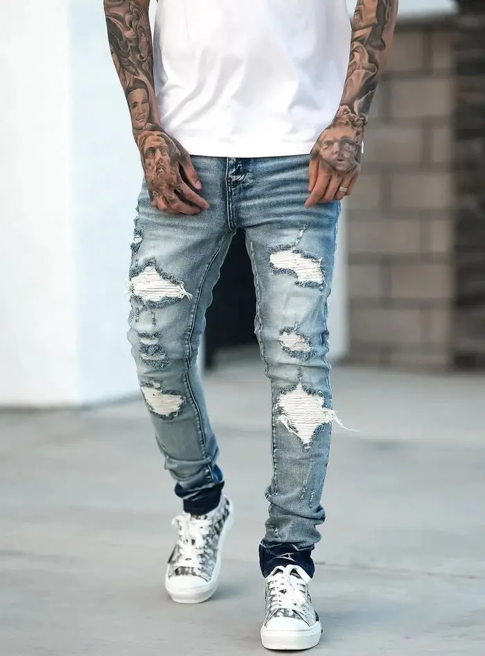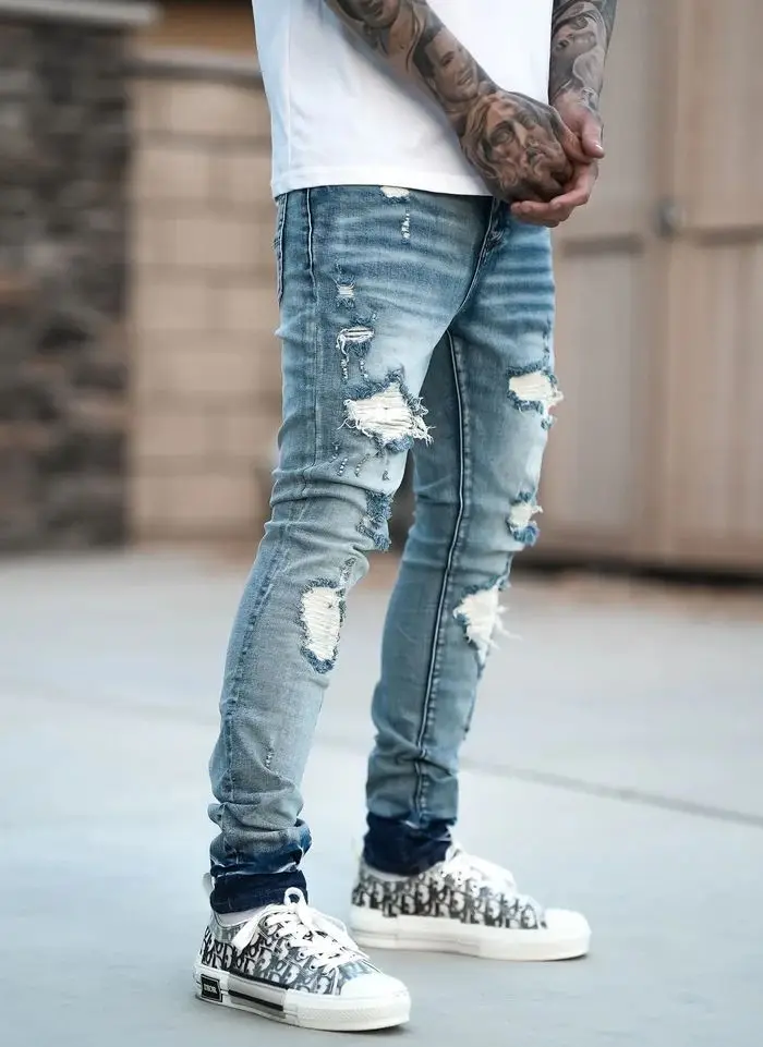Fashion Street Style Ripped Skinny Jeans Men Vintage Wash Solid Denim Trouser Mens Casual Slim Fit Pencil Denim Pants Hot Sale